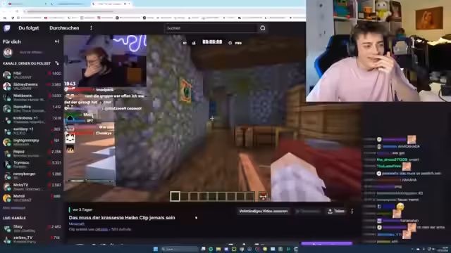 05:37:14Der Streamer verfolgt weiterhin das Spiel von Veto und kommentiert dessen Fortschritte und Schwierigkeiten. Veto gewinnt und spielt die nächste Wave. Es wird über die bevorstehenden Gegner Warden und Wither spekuliert. Veto muss sich schnell Wege bauen, da er kein Holz hat. Die Zuschauer äußern ihr Mitgefühl und feuern Veto an. Es wird diskutiert, ob Veto die Wave überleben kann, insbesondere angesichts der Laser-Kombi und des Mangels an Blöcken. Der Streamer und andere Zuschauer kommentieren Vetos Spielweise und äußern ihre Bewunderung für seine Ausdauer. Es wird die Frage aufgeworfen, ob Veto Square-Rüstung hat. Es wird über die Schwierigkeit der bevorstehenden Wave mit Guardians diskutiert. Der Streamer gibt Julian den Hinweis, wo sich ein Gegner befindet. Es wird über die Schwierigkeit der Situation diskutiert, insbesondere angesichts des Fallschadens und des Mangels an Ressourcen. Der Streamer und die Zuschauer feuern Veto an und loben seinen Kampfgeist.
