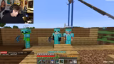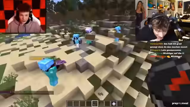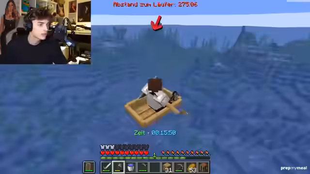 00:24:04Das Duo-Manhunt-Event beginnt offiziell. Die ersten Minuten sind geprägt vom Aufbau der Grundlagen: das Sammeln von Rohmaterialien wie Holz und Stein, das Töten von Dorfbewohnern für Eisen und das Craften von grundlegenden Werkzeugen und Rüstungsteilen. Die erste Bedrohung durch einen Hunter stellt sich als relativ harmlos heraus und wird schnell abgewehrt. Die Runner entwickeln eine Strategie: einer konzentriert sich auf den Speedrun, der andere auf den PvP-Aspekt, und sie nutzen Gegenstände wie Lavaeimer und Wasser zum Verteidigen.