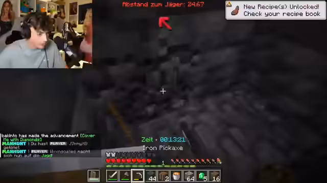 02:56:49Der Streamer begibt sich in den Nether, um Ressourcen wie Diamanten und braune Pilze für die Regeneration zu finden. Die Situation wird kritisch, da er kaum Essen und keine braunen Pilze hat, was ihn verwundbar macht. Während er durch den Nether navigiert, werden Jäger gesichtet, und er muss ums Überleben kämpfen. Die Spannung bleibt hoch, besonders als er Jägern ausweicht und auf Glück angewiesen ist, um notwendige Materialien zu finden.