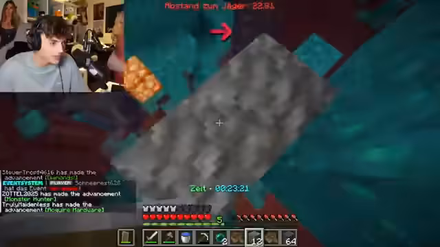 03:13:50Der Streamer wird von Jägern durch den Nether gejagt, während er verzweifelt nach Ressourcen sucht. Er muss ständig auf der Hut sein, um nicht von mehreren Jägern gleichzeitig gestellt zu werden. Die Situation wird prekär, als er kaum noch Essen hat und keine braunen Pilze zur Regeneration finden kann. Die anhaltende Verfolgung und das knappe Inventar erhöhen die Wahrscheinlichkeit, dass er eliminiert wird.
