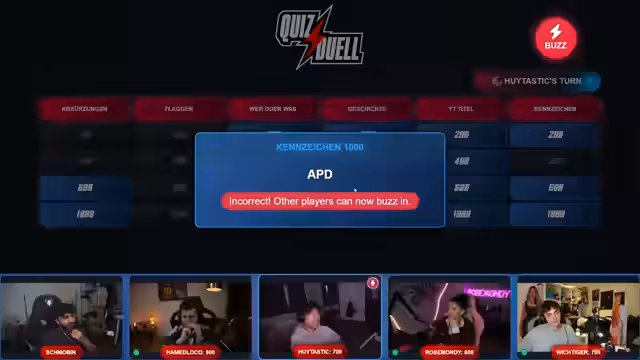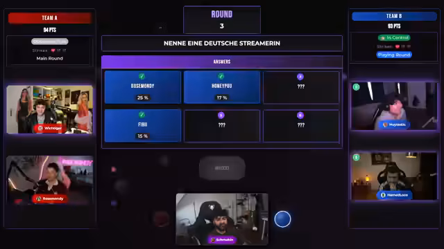 00:27:02Die Quizshow beginnt mit einem Teamnamenwettbewerb. Bei der ersten Frage sollen körperlich kleine Streamer genannt werden. Nach einigen Vorschlägen wie Papa Platte und Ronny Berger nennt Hui den Streamer Hugo, der auf Platz 5 landet. Die Teams wechseln sich bei den Fragen ab, wobei Themen wie Dinge, die man oft verliert, deutsche Streamer und historische Ereignis behandelt werden.