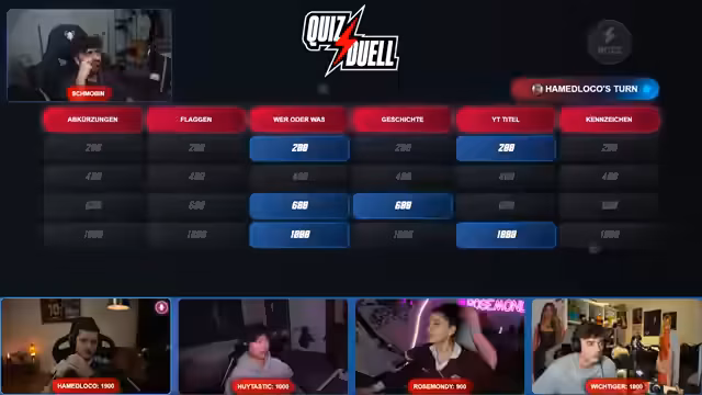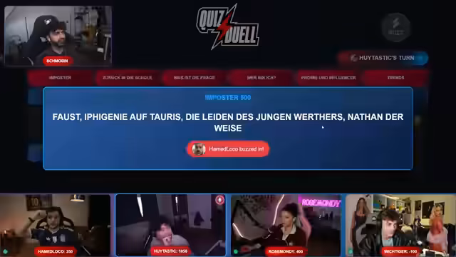 00:08:45Der Streamer hat geplant, heute eine Minecraft Speedrun-Session mit 100 Jägern durchzuführen. Zusammen mit Schmobbin wird jedoch zunächst eine Quizshow veranstaltet. Bei der Quizshow treten Teams in verschiedenen Kategorien wie körperlich kleine Streamer, Dinge, die man oft verliert, bekannte deutsche Streamer und mehr gegeneinander an. Die Teilnehmer sind Hui, Rose, Hamid und der Streamer selbst.