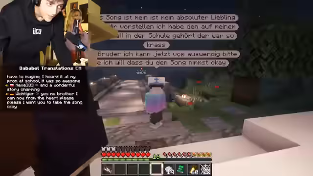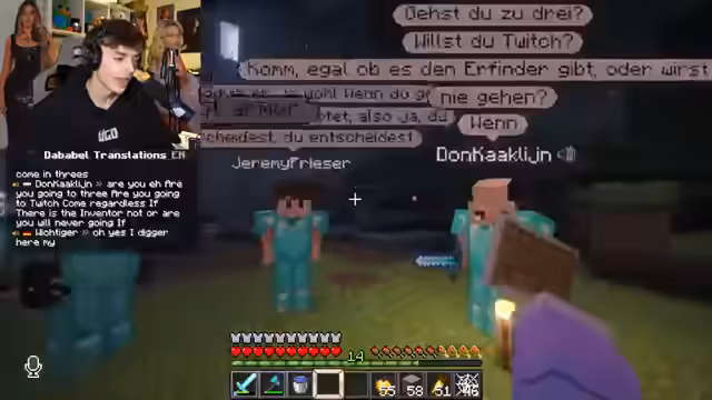 08:34:50Der Streamer wechselt von englisch zu deutsch, als er bemerkt, dass viele Zuschauer deutschsprachig sind. Er unterhält sich mit dem Chat über bevorstehende Prüfungen und streamt fort, da es ihm perfekt in den Zeitplan passt. Die Zuschauer interagieren aktiv, indem sie ihm bei Problemen mit dem Spawner, Mob-Farm-Designs und anderen Spielmechaniken helfen, was den Chatverlauf mit Fragen und Lösungen anreichert.