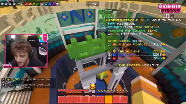 03:03:10Der Streamer bewertet seine eigene PvP-Leistung als schlecht und stellt fest, dass dies nicht die Stärke des Teams ist. Dennoch halten sie sich überraschend gut und befinden sich zur Halbzeit im Mittelfeld der Tabelle. Die Strategie für die verbleibenden Spiele, insbesondere das kommende 'Hole in the Wall', wird diskutiert. Das Team plant, defensiver zu spielen und die Gewohnheit, 'zu copen', abzulegen, um die Chance auf einen Einzug ins Finale wahren zu können.