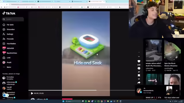 00:34:09Es findet eine Vorstellungsrunde des Minecraft-Teams statt, bestehend aus Fancy, Krusty, Luca und Mino. Jedes Mitglied stellt sich kurz vor und nennt einen Grund, warum das Team das morgige Event gewinnen wird. Anschließend wird besprochen, welche Minecraft-Spielmodi beim Event gespielt werden, darunter Parcours, Escape Room und Hide and Seek. Das Team schaut sich ein TikTok-Video an, das das Event bewirbt und die verschiedenen Spielmodi erklärt. Es wird versucht, gemeinsam auf einen Minecraft-Server zu kommen, um zu üben, aber es gibt technische Schwierigkeiten, da einige Teammitglieder gekickt werden oder Probleme mit dem Beitritt haben. Trotz der Schwierigkeiten wird beschlossen, mit dem Training zu beginnen und die verschiedenen Spielmodi auszuprobieren. Es wird über die Fähigkeiten der einzelnen Teammitglieder diskutiert und versucht herauszufinden, worin sie gut sind, um die Strategie für das Event festzulegen.