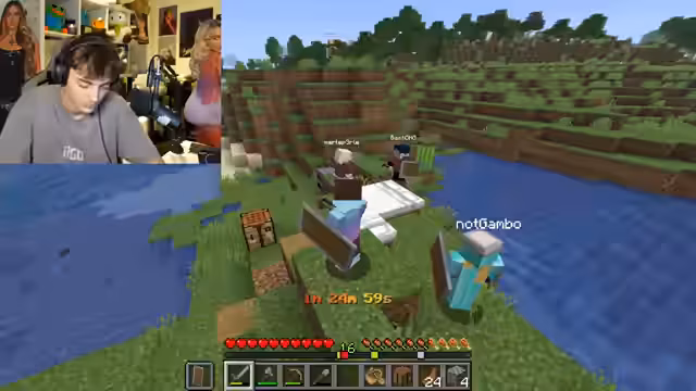 01:01:03Das Team erkundet eine Küstenregion und entdeckt ein großes Ocean Monument in der Nähe eines Dorfes. Die Herausforderung besteht darin, alle Teammitglieder ohne Schaden in ein Bett im Dorf zu bringen. Ein Mitglied hat bereits einen Betrag von 25.600 Blöcken aus dem entfernteren Dorf gemeistert. Wichtige Ressourcen wie Heu und Holz werden gesammelt, und ein Creeper gesichtet, der eine Bedrohung darstellen könnte.