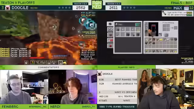 02:35:28Das Spiel zwischen Dougal und Hex ist von höchster Präzision geprägt. Dougal führt leicht mit 5 Sekunden Vorsprung durch optimiertes Craften von Gold und schnelles Nether-Portal-Bauen. Hex zeigt reaktionsschnelle Anpassungen, etwa durch Blazes-Töten mit Steinschwert-Kritical Hits und effizientes Pearl-Werfen. Beide nutzen taktische Manöver wie das Platzieren von Gravel für Flint oder das Ausnutzen von Lichtverhältnissen im Nether. Dougal behebt Fehler wie vergessene Portale, während Hex mit Fire-Resist-Potions und Nahrungsmangel kämpft. Das Duell bleibt eng, mit Wechseln zwischen Stronghold-Suchen und End-Vorbereitungen, die bis zum letzten Moment unentschieden bleibt.