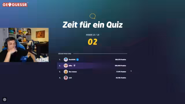 01:44:28Die Session startet mit erfolgreichen GeoGuessr-Runden, die in Bulgarien und Serbien lokalisiert werden. Die Euphorie ist groß, als mehrere Spiele gewonnen werden. Es wird über ein mögliches Creator-Turnier mit Basti diskutiert, wobei Mike als Favorit gehandelt wird. Der Gedanke, Basti zu manipulieren, um ein solches Turnier zu veranstalten und dann zu gewinnen, wird humorvoll in den Raum geworfen. Es wird überlegt, dass eine Niederlage gegen Action Pflicht sei, um die Spannung zu erhöhen. Nach einer Glückssträhne von fünf aus fünf richtigen Antworten wird die Idee eines Teamnamens für zukünftige Spiele aufgebracht. Namen wie 'Wichtiger Hui', 'Huwi-Tiger' und 'Mic-Tastic' werden diskutiert. Es folgt eine kurze Anekdote über das ungewöhnliche Lachen des Streamers, das mit Wassertropfen verglichen wird, und ein Kompliment für das einzigartige Dach. Die nachfolgenden GeoGuessr-Runden führen nach Slowenien, Tschechien und Kroatien, wobei die spezifischen architektonischen Merkmale der Regionen erkannt werden. Die Schwierigkeit, genaue Standorte zu bestimmen, wird thematisiert, insbesondere in Polen, wo versucht wird, geografische Muster zu erkennen. Trotzdem gelingt es, das hohe Ranking von 959 zu halten, was dem Master-Niveau entspricht, und die Idee von 'wichtiger E-Sport' wird spielerisch aufgegriffen. Eine Runde wird in Norwegen oder Kanada vermutet, was aber fehlschlägt. Am Ende werden die Zuschauer gefragt, ob sie lieber NoMove spielen wollen.