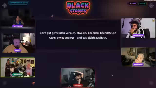02:41:58Der Streamer präsentiert die nächste Black Story mit dem Titel 'Katastrophale Kur: Beim gemeinten Versuch, etwas zu beenden, beendete ein Onkel etwas anderes und das gleich zweifach'. Die Teilnehmer müssen herausfinden, was der Onkel beenden wollte und wie beide Personen starben. Die Diskussionen konzentrieren sich auf die genaue Bedeutung des Wortes 'Kur' und die Art des Problems, das der Neffe hatte. Die Teilnehmer stellen viele Fragen zur Todesursache und zur Absicht des Onkels.