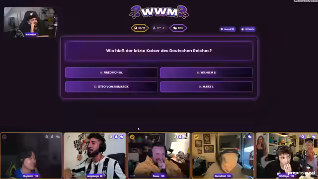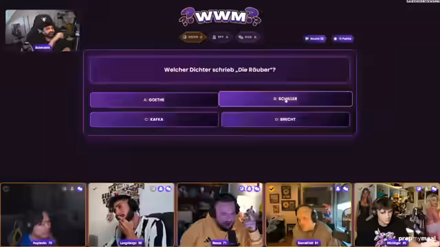 01:01:12Zu Beginn des Quizshowssegments wurden Fragen zur Chemie und Literatur gestellt. Der Streamer hatte Schwierigkeiten mit der Frage nach dem Element mit der Ordnungszahl 1, weshalb er sich für Wasserstoff entschied, obwohl er sich unsicher war. Bei der Frage nach dem Autor der 'Räuber' zog er Schiller vor, doch die richtige Antwort war Brecht. Darauf folgte die Frage nach der Anzahl der Videos auf dem Power-Platte-Kanal, bei der er nach einem kurzen Eingang auf einen Tipp hin für den höchsten Wert votierte.