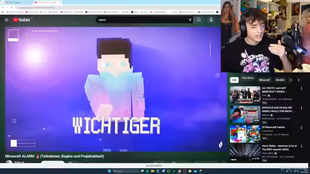 00:08:32Nach der Beendigung des Projekts 'Risko' wird das neue Minecraft PvP Projekt 'Minecraft Alarm' angekündigt. Es handelt sich um ein Trio-Teams Format, bei dem jeden Tag für eine Stunde gespielt wird. Wichtig ist dabei, dass es sich um eine Offline-Aufnahme handelt, die nicht gestreamt werden darf. Das Projekt beginnt wahrscheinlich diese Woche.