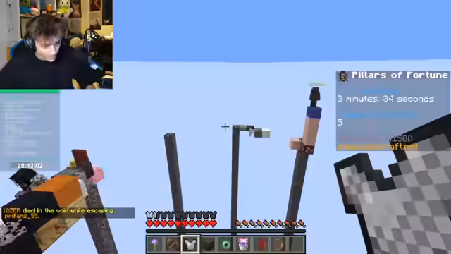00:10:04Das Gameplay konzentriert sich auf eine WinStreak Challenge im Modus Minecraft Skywars. Der Streamer spielt mit hoher Geschwindigkeit und macht dabei mehrere Fehler, wie das versehentliche Fallenlassen wichtiger Items oder das Übersehen von Spielern. Er schildert seine Frustration über das Spielverhalten anderer, insbesondere über sogenannte 'Noobs' oder nervige Gegner, und beschreibt, wie der Einsatz von Totems und Gap-Essenz das Gameplay beeinflusst und seine Strategien bestimmt.