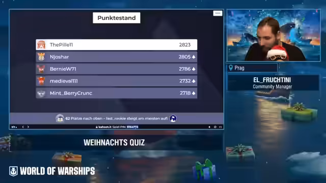 01:33:02Nach dem Übungsraum wird das Highlight des Abends, das Weihnachtsquiz, gestartet. Die Teilnehmer werden gebeten, das Tool Kahoot zu nutzen und ihre Ingame-Nicknamen einzutragen, um Preise gewinnen zu können. Die Preise reichen von kleinen Santa-Containern für die Plätze 4-10 über große Santa-Container für Platz 3 bis hin zu einem Stufe-8-Premium-Container für den Sieger. Die Fragen sollen sich um Weihnachtstraditionen in Deutschland, Österreich und der Schweiz drehen und als Single-Choice-Fragen gestellt werden. Nach technischen Vorbereitungen startet der Quiz mit einem Countdown.
