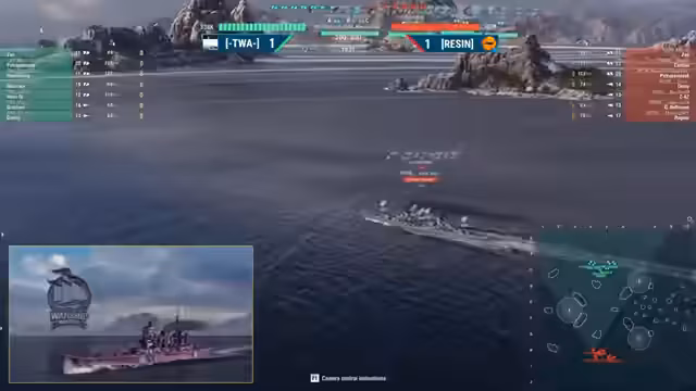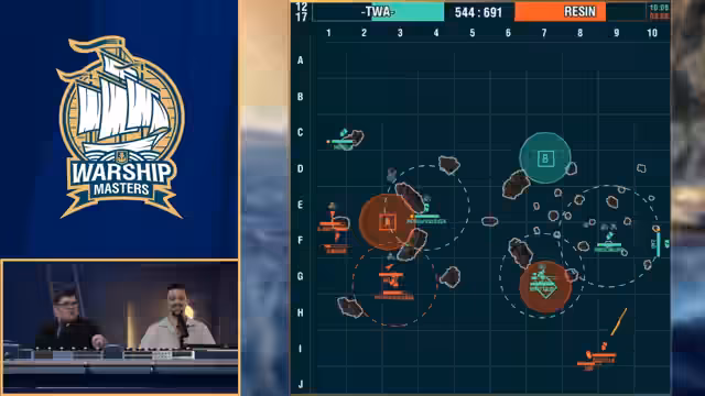 02:56:46Das Spiel beginnt auf der Karte Northern Waters. Kommentatoren diskutieren die Erwartungen, ob Teams konservativ spielen oder den ACAP-Punkt (contest cap) angreifen werden. TWA startet mit fünf Kreuzern (Zao, Petro, Hindenburg, Minotaur, Henri) und zwei Zerstörern (Grozovoi, Daring), während Resin eine klassische Kreuzer- und Zerstörer-Kombination mit Castilla, Zao, Petro-Pavlovsk, Hoffmann, Z52 und Ragnar aufbaut. Zunächst verlaufen die Bewegungen beider Teams ausgeglichen, mit TWA, das seine Kreuzer auf die B-Seite und die Zerstörer auf die C-Seite lenkt, während Resin eine ähnliche Verteilung wählt.