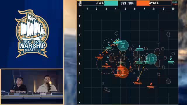 02:28:19Für das dritte Spiel wechseln die Teams auf die Karte Nord. Resen behält seine aggresiven Henri-Schiffe bei, während TWA nun eine Kreuzer-lastige Aufstellung mit Salem, Henri und Napoli wählt. Die Beobachtungen zeigen, wie TWA versuchte, mit den Airstrikes des Guden und Prinz Van Oranje Druck aufzubauen, während Resen auf einem strategischen Vorstoß entlang der 7-8-9-10-Linie setzte. Der Start dieses Spiels ist geprägt von ersten taktischen Manövern und Handelszügen zwischen den Schlachtschiffen.