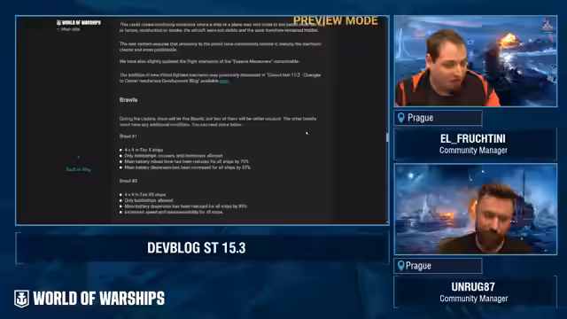 01:19:46Zwei neue, verrückte 'Brawls' werden eingeführt. Eines ist ein Schlacht auf Tier X, bei dem alle Schiffe einen 75 %-igen Ladungsbuff erhalten. Das andere findet auf Tier 7 statt und reduziert die Streuung der Hauptbatterie von Schlachtschiffen um 95 %. Zusätzlich wurde angekündigt, dass die nächste 'Clan Battle'-Saison auf Tier VI stattfinden wird, mit einem Schlachtformat von 7 gegen 7 ohne U-Boote oder Flugzeugträger und nur einem Schlachtschiff pro Team.