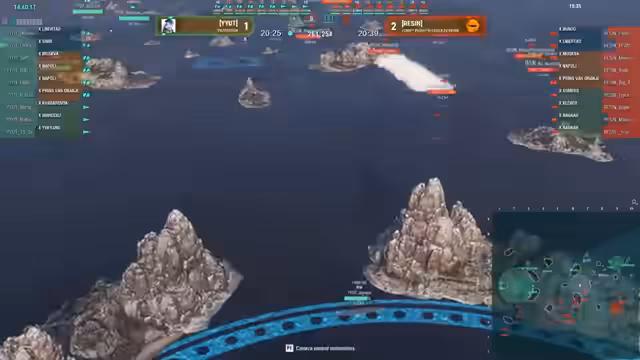 00:43:11Auf der Karte Sleeping Giant beginnen beide Teams mit aggressiven Vorstöße. Resin führt ein erfolgreiches Angriffsgeschwader aus drei Zerstörern (Gdansk, Kleber, Khabarovsk) gegen YYUTs Heimatbereich an. Das Timing und die Positionierung der Radar-Schiffe durch Rezens Moskva und Napoli sind entscheidend. Sie erwischen YYUTs Harugumo in einem tödlichen Kreuzfeuer, was sofort einen Kill und die Kontrolle über den Punkt C bedeutet. Dieser frühe Kill führt zu einer Kettenreaktion, bei der YYUTs Schlachtschiff Ohio und Zerstörer Kleber vernichtet werden. Trotz eines letzten Versuchs der YYUT-Moskva zur Gegenwehr kann Resin das Spiel nach 31 Minuten für sich entscheiden.