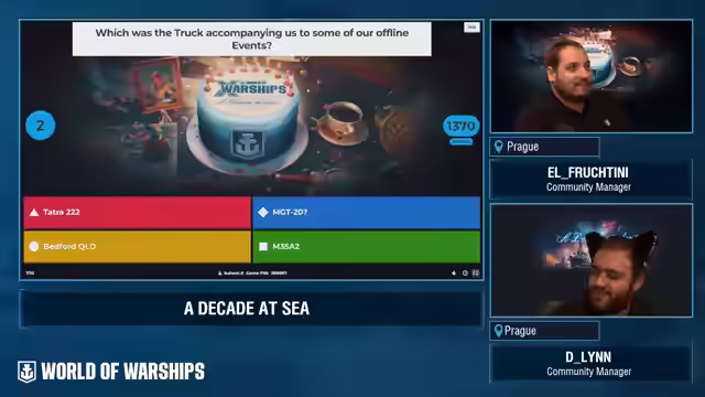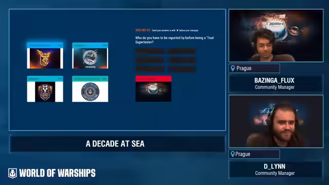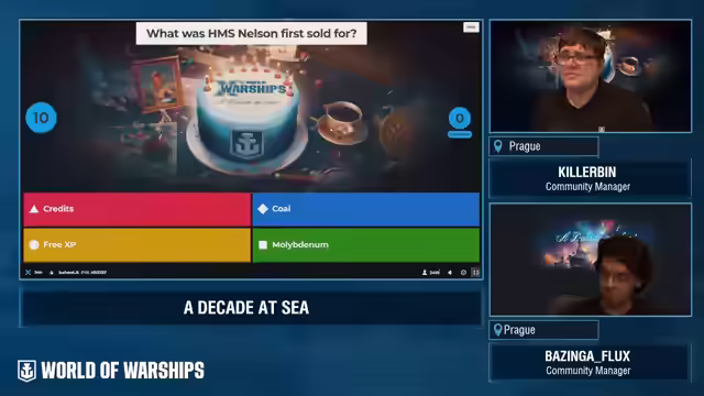 00:00:01Der Stream zum 10-jährigen Jubiläum von World of Warships aus Prag beginnt mit der Vorstellung der Moderatoren und einem Ausblick auf die kommenden Inhalte. Es werden spezielle Twitch-Drops und Giveaways angekündigt, darunter ein Quiz am Ende der ersten Stunde, bei dem ein besonderer Kreuzer verlost wird. Die Moderatoren blicken auf ihre Zeit bei World of Warships zurück und schwelgen in Erinnerungen an die Anfänge des Spiels. Trotz Spekulationen im Chat, dass es sich um die Makarov handelt, wird klargestellt, dass der zu verlosende Kreuzer etwas aufregenderes sein wird. Zusätzlich wird bei Gewinn eines bereits vorhandenen Schiffs eine Doubloon-Entschädigung angeboten, wobei die Menge der Doubloons von der 'Grand Voyage'-Kampagne abhängt, die bis zu 32.000 Doubloons betragen kann. Ein Bonuscode namens 'Cake for Quacken' wird geteilt, der bis 19:00 Uhr MESZ mit 10.000 Aktivierungen gültig ist und thematisch zum 10-jährigen Jubiläum passt.
