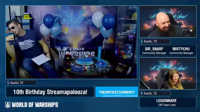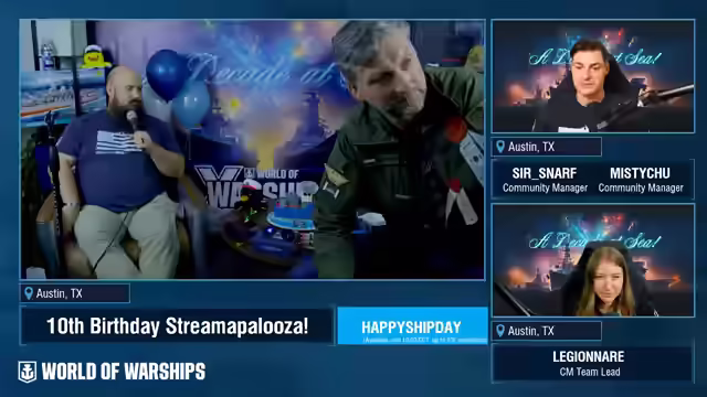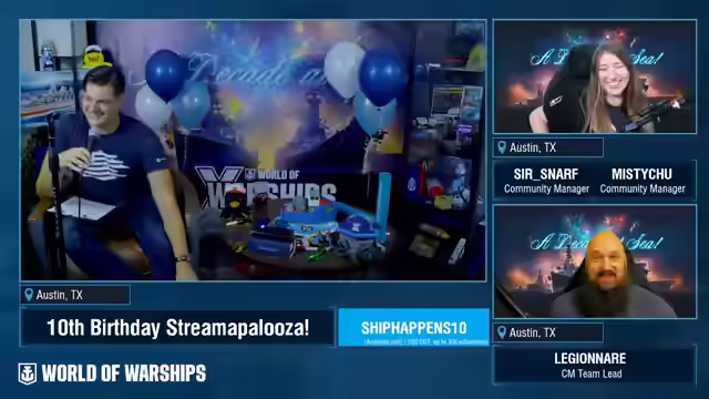 05:32:26Das NA-Team meldete sich aus Austin und begrüßte die Zuschauer, nachdem das EU-Team den Stream übergeben hatte. Man bedankte sich bei den Zuschauern für ihre Teilnahme und dafür, dass sie die letzten zehn Jahre so besonders gemacht haben. Es wurde angekündigt, dass es neue Belohnungskanalpunkte gibt, mit denen die Zuschauer den Stream ein wenig chaotischer gestalten können. Der Chat wurde nach seiner Erfahrung mit dem EU-Team gefragt. Es gab einige technische Schwierigkeiten mit dem Gameplay, aber das Team arbeitete daran, diese zu beheben. Es wurden Goodie-Giveaways, Trivia-Spiele und Tier-Crates von Tier 6 bis Tier 8 angekündigt, sowie einige 'naughty ships', die möglicherweise nicht da sein sollten. Außerdem wurde ein Code namens 'Ship Happens 10' angekündigt, der für Goodies eingelöst werden kann und stündlich für die nächsten drei Stunden erneuert wird.