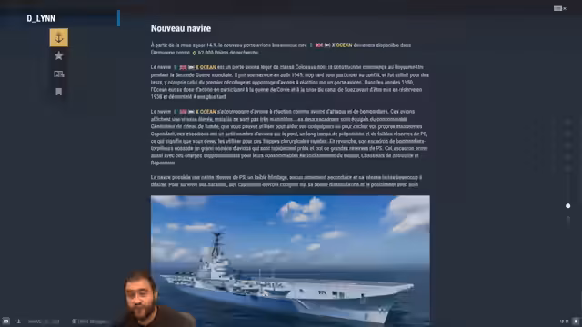 00:19:22Die neuen Schiffe der Armurie werden präsentiert. Der Océan ist ein Tier-10-Flugzeugträger mit Jet-Flugzeugen, der nur eine Torpedogeschwader und zwei taktische Geschwader (Bomben und Raketen) besitzt. Er wird für Research- und Kohlenressourcen erhältlich sein. Zudem wird die Defense, ein US-Schwerer Kreuzer mit exzellenter HE- und AP-Penetration, vorgestellt. Beide Schiffe werden ihre Besonderheiten im Kampf demonstriert.