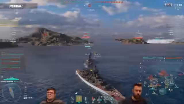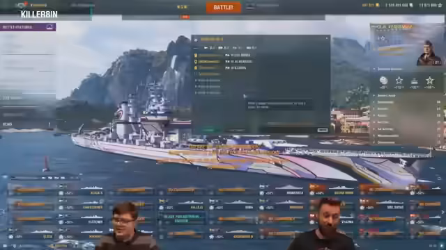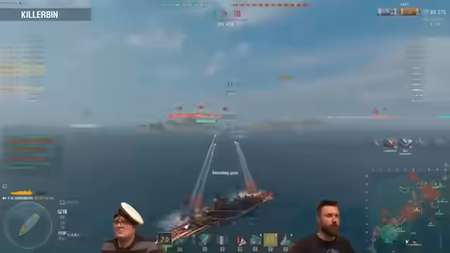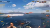 02:23:50Ein wichtiger Moment im Stream ist, als einer der Streamer zum ersten Mal die Azure Lane Hindenberg spielt und dabei zugibt, noch nie den deutschen Kreuzer-Tech Tree in seiner größten Form, die Hindenburg, gespielt zu haben. Die Unterschiede zwischen den Azure Lane Schiffen und ihren Tech-Tree-Versionen werden erläutert: Sie haben nur die üblichen Premium-Vorteile wie Commander-Transfer und erhöhte Credits, keine speziellen Stats. Bei der Montpellier, die im Armory stark reduziert ist, wird jedoch erwähnt, dass sie genauer ist als die Cleveland, aber eine längere Nachladezeit hat.