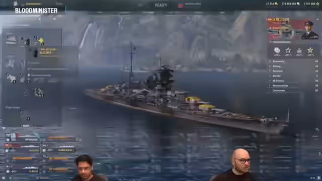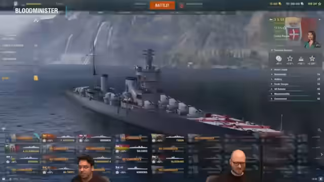 01:13:14Der Fokus liegt auf dem deutschen Kreuzer Blücher. Crysantos zeigt seine historisch inspirierte Tarnung, die Einschläge des Schiffes darstellt, und äußert seine Vorliebe für dezentere Tarnungen. Er geht auf die Panzerungsdetails ein, die durch 27 mm Panzerung an der Broadside anfällig für Overmatch durch Standard 406-mm-Geschütze ist. Die Überlebensfähigkeit wird mit 45.000 HP angegeben und die Ausrüstung wie Zielsystem-Modifikation und hydroakustische Suche wird als sinnvoll erachtet.