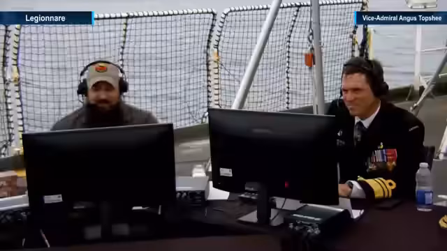 01:28:41Ein besonderer Gast ist Commander Senior Grade Petraeus der dänischen Marine, die an der gemeinsamen Übung Cutlass Fury mit den kanadischen Kollegen teilnahm. Die dänische Marine, die in Grönland und den Färöern stationiert ist, wurde für die Übung eingeladen. Die Zusammenarbeit wurde als sehr positiv beschrieben und unterstreicht den engen Kontakt zwischen den beiden Nationen. Die Übung selbst war ein Anti-U-Boot-Kriegsfahrmanöver, das wie im Spiel dient um sich zu verbessern.