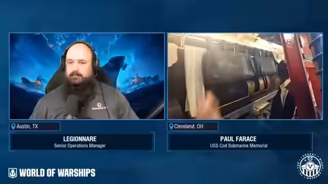 04:12:58Der Stream wechselt zum Live-Bericht vom Museumssubmarine USS Cod in Cleveland. Kurator Ben Yankee und Direktor Paul Frey zeigen den Zuschauern das Innere des unmodifizierten Schiffes. Sie erklären die einzigartigen Merkmale des Bootes, darunter die funktionstüchtigen Torpedorohre, die Nachbildungen von Mark-II-Sprengladungen und die originalgetreue Einrichtung, die den Zustand von 1945 widerspiegeln. Die Besonderheiten amerikanischer Flotten-U-Boote wie die getrennten Schlaf- und Aufenthaltsräume für die Besatzung werden hervorgehoben.