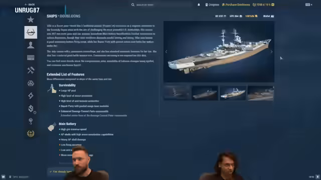 00:10:12Der Streamer beginnt mit einer detaillierten Vorstellung des Premium-Schiffs Scarlet Thunder, einem Schlachtschiff der Stufe 9. Er vergleicht es intensiv mit dem Duncan, hebt aber die wesentlichen Unterschiede hervor: Scarlet Thunder hat eine Hauptgeschützreichweite von über 22 km im Vergleich zu Duncans 20 km, hat aber keine Torpedos und keinen Speed-Boost. Er erklärt, dass Scarlet Thunder als traditionelles Schlachtspiel konzipiert ist, was es für Spieler interessant macht, die einen Lieblingskapitän einsetzen möchten, ohne ihn neu ausbilden zu müssen.