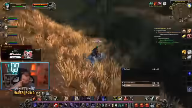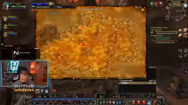 04:31:54Im Hinterland gibt es kaum Quests für die Allianz, was den Streamer frustriert. Er überlegt, in Sengende Schlucht zu gehen, wo es Quests ab Stufe 43 gibt. Eine alternative Idee ist, stundenlang stupide Mobs zu klatschen, um ein Level zu erreichen. Doch das hält er für ineffizient. Stattdessen wird versucht, in die Senkelschlucht zu gehen, was jedoch problematisch ist, da es sich um Quests für Stufe 50 handelt.