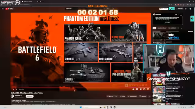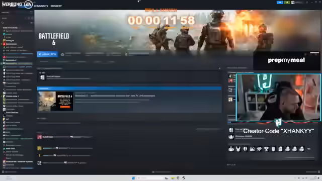 01:47:24Die Vorfreude auf Battlefield 6 ist riesig, doch der Zugang gestaltet sich schwierig. Der Streamer ist ungeduldig und nervös, da die offiziellen Server für den Launch noch nicht online sind. Er konnte in der Vorwoche jedoch schon eine andere Version spielen und etwas aufnehmen, was ihm einen Vorteil verschafft. Die Anmeldung für den EA-Creator-Code wird angekündigt, um Fans kostenlos unterstützen zu können. Es wird EA Play Pro als Alternative zum Kauf beworben, um das Spiel vor dem Kauf zu testen. Der Startschuss ist für 17 Uhr geplant, um dem offiziellen Launch zu entsprechen.