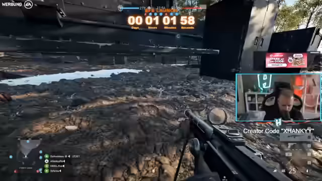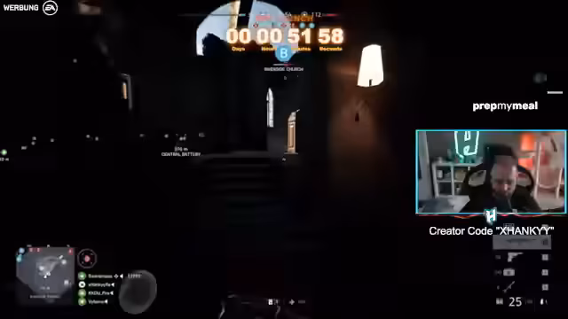 01:47:24Der Streamer äußert große Nervosität und Vorfreude auf Battlefield 6, da die Server noch nicht verfügbar sind, aber er bereits in der Woche spielen und Aufnahmen machen konnte. Er stellt seinen EA Creator Code 'X-Hanky' vor, der es Zuschauern ermöglicht, ihn beim Kauf im EA Store durch Eingabe des Codes kostenlos zu unterstützen. Zusätzlich erklärt er, dass EA Play Pro eine Alternative bietet, das Spiel für einen Monat zu testen, falls man es direkt kaufen möchte.