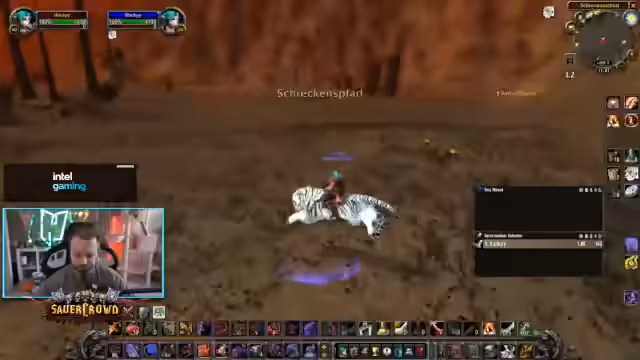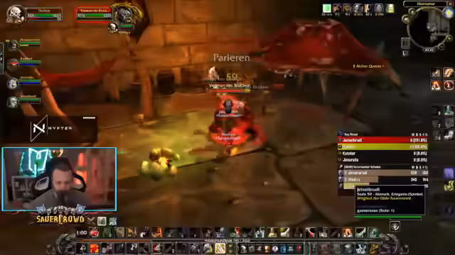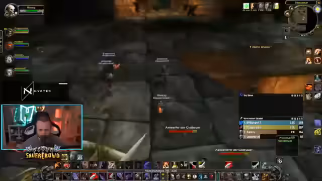 08:34:48Die Gruppe steht vor einem gefährlichen Boss, der einen Ghost-Reiter spawnen kann. Der Streamer warnt vor den hohem Schaden des Bosses und fragt nach Wuttränken. Die Taktik wird angepasst, da einer der Spieler keine Wuttränke hat. Die Gruppe bespricht die Rollen und versucht, den Boss sicher zu besiegen, während sie auf mögliche Adds achten müssen.