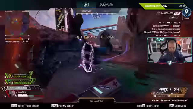 17:07:44Es wird eine Rank-Challenge erwähnt, bei der wöchentlich ein neues Spiel gespielt wird, um den höchsten Rang zu erreichen. Aktuell wird auf Battlefield gewartet, während Apex weiterhin gut läuft. Es wird die Entscheidung, mit Randoms im Spiel mitzufahren, kritisiert. Nachfolgend wird über das Verhalten anderer Spieler diskutiert, insbesondere über einen Revenant, der abseits des Teams agiert. Es wird festgestellt, dass es sich um eine Pred-Lobby handelt, was die Schwierigkeit des Solo-Q-Spielens verdeutlicht. Abschließend wird die eigene Hilflosigkeit angesichts des Verhaltens der Teammitglieder betont und die resultierenden Punktverluste beklagt.