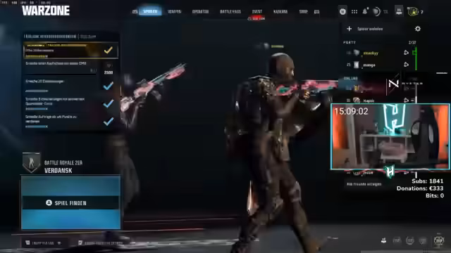 00:03:38Der Stream wechselt komplett zu Call of Duty: Warzone. Zuerst gibt es Diskussionen über einen möglichen Wechsel von Maus/Tastatur auf Controller, basierend auf dem Ratschlag von Lipton, dass nach drei Monaten täglichen Spielens mit Controller die Leistung besser sein könnte. Der Streamer startet mit dem Bot-Modus, um sich an das Controller-Gameplay zu gewöhnen, da sein PS5-Controller nicht verfügbar ist.