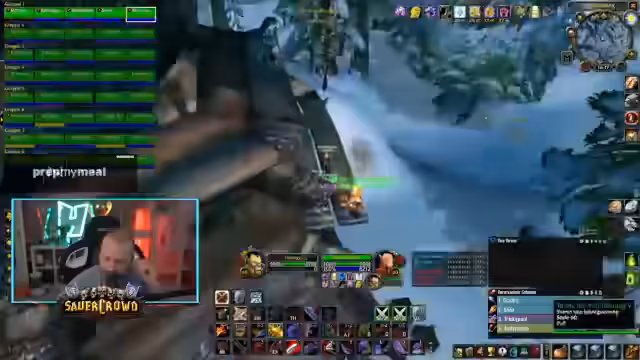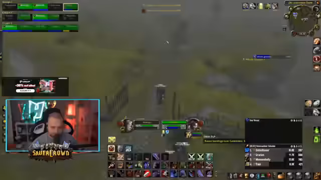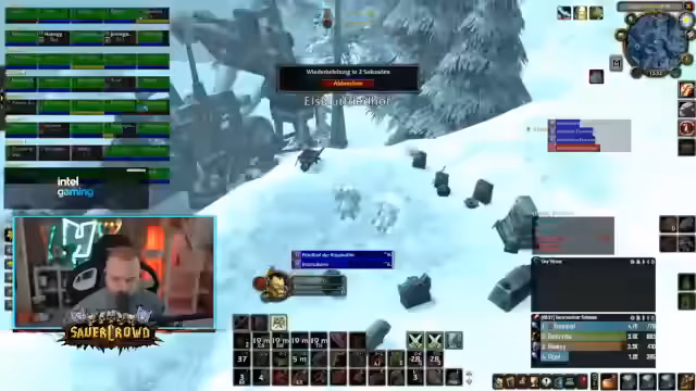 02:49:46Der Streamer stößt auf massive Gegenwehr in Form einer gegnerischen Gruppe mit drei Priestern und zwei Paladinen. Durch deren Schilde und Heilungen ist es extrem schwierig, Schaden zu verursachen und Wut zu generieren. Nach gescheitertem Versuch, den Tower zu halten, wird auf eine alternative Strategie umgestellt, um die Ressourcen für eine spätere Offensive zu schonen und einen anderen Tower ins Visier zu nehmen.