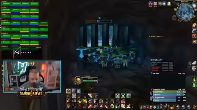 08:39:18Der Streamer plant, eine 10er-Gruppe für PvP-Schlachtfelder zusammenzustellen, stößt aber auf Herausforderungen. Viele Gildenmitglieder haben frisch geboostete Charaktere, die nicht voll ausgerüstet sind. Dies könnte im PvP gegen gut ausgerüstete Gegner zu Nachteilen führen. Trotz der Bedenken versucht er, eine ausgewogene Gruppe mit Heilern und Schadensspielern zu formen. Es werden verschiedene Namen und Klassen für die Gruppe diskutiert, um eine möglichst starke Kombination zu finden.