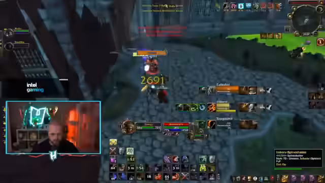 00:02:08Der erste Arena-Kampf beginnt gegen ein Rogue/Priest-Team. Durch den Einsatz von Pain Suppression und Cyclone gelingt es dem Gegner, den Streamer stark zu kontrollieren. Trotzdem kann der Streamer das Team besiegen, da der Priest kaum Mana Burn einsetzt und der Rogue keinen nennenswerten Druck erzeugen konnte. Der Streamer bewertet das Match als einen sehr guten Start und nennt die Gegner als smooth und schlagbar.