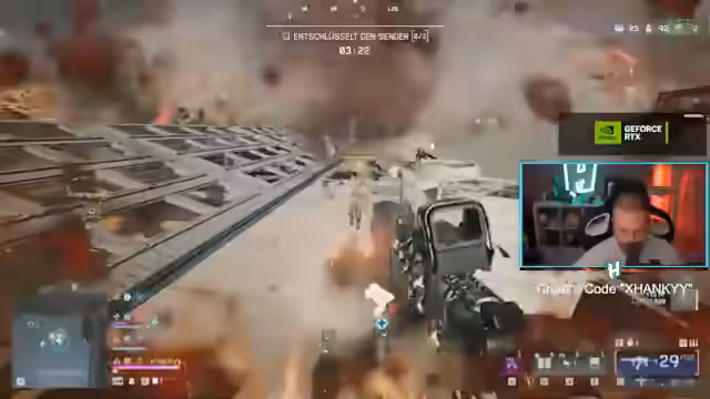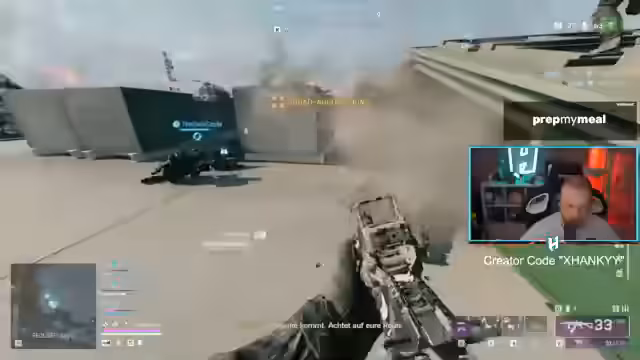 05:32:37Die Squad gerät in eine kritische Lage, als ein gegnerischer Panzer den Streamer anvisiert. Mango nutzt eine Luftlandung, um den Gegner zu eliminieren. Gleichzeitig droht der Feuersturm, was den Druck erhöht. Die Teammitglieder arbeiten zusammen, um sich zu decken und Marco hinter einem LKW in Sicherheit zu bringen. Die Situation zeigt die Wichtigkeit von Cover und koordinierter Hilfe im Team.