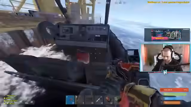 01:32:15Der Streamer unternimmt einen spektakulären ersten Flug mit einem gekauften Hubschrauber zum Cargo Ship, der gerade im Hafen angelegt ist. Trotz anfänglicher Schwierigkeiten beim Landen gelingt ihm die Landung auf dem Deck des Schiffes. Gemeinsam mit seinem Team-Kollegen Vase erkunden sie das Schiff. Es ist bemerkenswert ruhig, mit wenigen computergesteuerten Gegnern (Bots). Das Team lootet drei große Kisten, die hochwertige Beute wie Tech Trash, HQM, Munition und explosives Material enthalten. Dies stellt einen der lukrativsten Loots im Stream dar und stärkt den positiven Teamgeist.