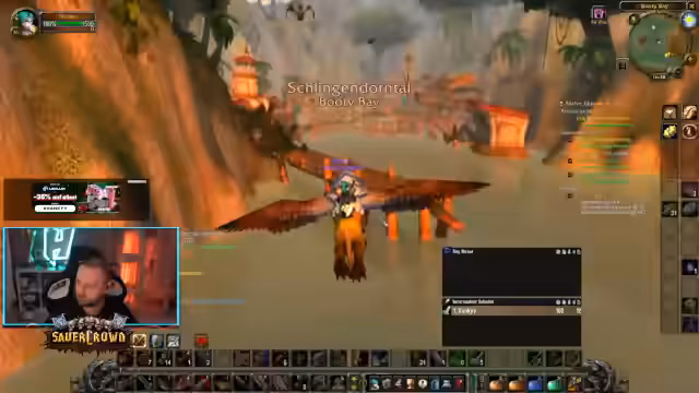 00:09:07Nachdem der Streamer den Buff eines Events erhalten hat, muss er sich für sein nächstes Spielgebiet entscheiden. Er erwägt das nördliche Schlingdorntal oder Desolais, wobei er Letzteres als zu riskant ansieht. Er entscheidet sich, zunächst nach Booty Bay zu fliegen, um den dortigen Flugpunkt zu sichern und weitere Quests anzunehmen. Der Streamer kündigt an, sich für kurze Zeit auszuloggen, um seinen wertvollen Buff zu behalten, und danach weiterzuspielen.
