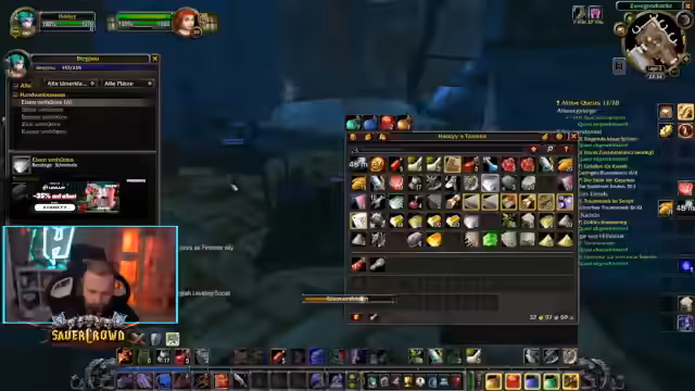 10:45:32Der Streamer widmet sich der Optimierung seiner Ausrüstung und dem Management seines vollen Inventars. Er diskutiert den Tausch von Rüstungsteilen und den Nutzen von Add-ons zur Item-Bewertung, wobei er sich auf die eigene Analyse verlässt. Ein zentrales Problem ist die überfüllte Bank, die er als Fickung bezeichnet, da das nächste Fach 10 Gold kostet. Er organisiert den Transfer von Gegenständen wie Wollstoff und Bronzeröhren für Gildenmitglieder und quests, während er Inventarplatz freimacht.