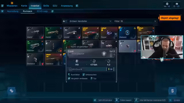 02:53:26Es wird diskutiert, wie man Items aus dem Inventar entfernt, da dieses voll ist. Fallenlassen von Gegenständen erweist sich als schwierig, da die Option im Menü fehlt oder nicht wie erwartet funktioniert. Ein Spieler findet schließlich heraus, dass man die 'R'-Taste gedrückt halten muss, um Items fallen zu lassen. Es folgt eine Diskussion über ein gefundenes lila Schild, welches ein Spieler an Chris weitergibt, da sein eigenes Schild weniger schnell regeneriert. Die Werte und Regeneration des Schildes werden verglichen, um das beste Schild zu finden. Es wird festgestellt, dass ein Schild zwar mehr Schutz bieten kann, aber eine langsamere Regeneration hat.