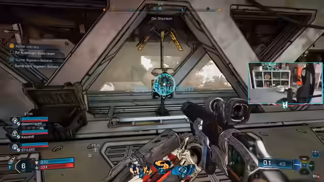 02:55:15Die Gruppe setzt ihren Weg fort und nutzt Markierungen, um den Weg zu finden. Ein Spieler verliert sein Schild versehentlich und muss zurück, um es wiederzuholen. Es wird über das versehentliche Fallenlassen von Gegenständen diskutiert. Ein Spieler tauscht sein Schild gegen ein besseres aus. Es wird kurz über die Bedeutung von SDU (Storage Deck Upgrade) gesprochen, um mehr Waffen und Munition tragen zu können. Ein Spieler entdeckt eine blaue Pistole und überlegt, diese auszuwählen. Die Gruppe trifft auf einen 'Badass, der Fleischer' und versucht, ihn zu besiegen. Ein Spieler ist von der Position abgeschnitten und sucht nach einem Weg zurück zur Gruppe. Es wird ein Aufzug erwähnt, der möglicherweise Teil der Mission ist.