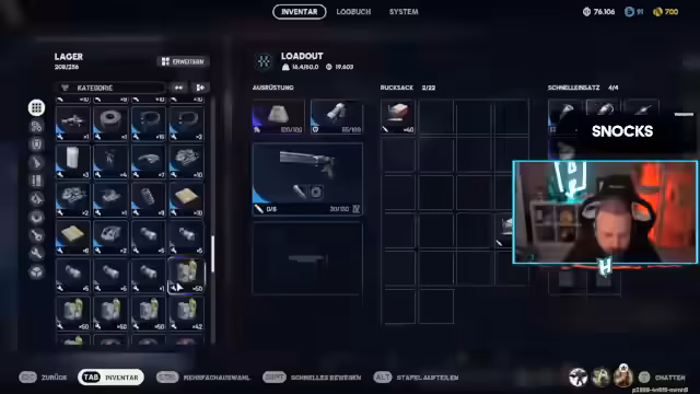 01:05:03Nachdem sie den Bosskämpfe und andere Spieler hinter sich gelassen haben, finden sie einen reichlich gefüllten Raum mit vielen Ressourcen. Der Streamer ist frustriert, da er zu viele Gegenstände besitzt und seinen Rucksack nicht mehr vollpacken kann, während auch der Lagerraum voll ist. Der Spaß am Gameplay wird durch die ständigen technischen Probleme und den hohen Druck im PvP überschattet.