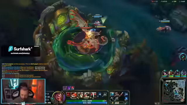 08:50:24Die Teamzusammensetzung für die kommenden Matches wird besprochen, insbesondere die Ersetzung von Kani durch Hüffi, einen erfahrenen Support-Spieler. Die Beziehung zwischen dem Streamer und Kani wird als ungewöhnlich nett für ein ADC-Supporter-Verhältnis hervorgehoben. Eine kurze Werbeunterbrechung für den VPN-Partner Surfshark wird eingeblendet, wobei die Vorteile wie Datenverschlüsselung, werbefreies Surfen, unbegrenzte Geräteanzahl und die Umgehung von Geo-Restriktionen betont werden. Das Angebot, vier Monate zusätzlich zu erhalten und eine 30-Tage-Geld-zurück-Garantie, wird hervorgehoben. Nach der Promotion wird der Wunsch geäußert, Solas Quadra-Kill zu zeigen, bevor das nächste Spiel beginnt. Es wird auch über die Stärke von Akali diskutiert, einem Champion, der als sehr stark, aber auch schwer zu spielen gilt.