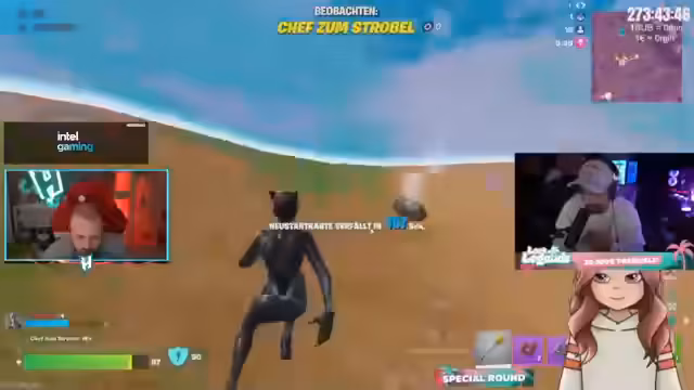 05:17:37Die Endphase der Special Round ist von Chaos geprägt, in dem die meisten verbliebenen Spieler nur noch mit Pickaxes kämpfen. Es kommt zu einem dramatischen Kampf um den Sieg, bei dem die verbliebenen Spieler sich gegenseitig attackieren. Der Streamer beobachtet den möglichen Sieger, Chef Strubel, der mit Impuls-Granaten und Heilmitteln agiert. Das Team erleidet einen Double-Snipe und wird eliminiert, was sie als unglücklich bewerten, während der Gesamtsieg des Turniers an ein anderes Team geht.
