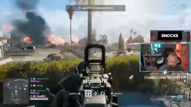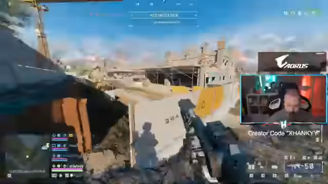 08:54:38Die Szene ist von intensiven, dynamischen Kämpfen geprägt, bei denen ein Weapon-Drop ein zentrales Ziel ist. Während eines Angriffs kommt es zu einem massiven Airstrike, der laut Streamer zwei Gegner eliminiert. Allerdings entsteht eine Kontroverse, da der Killfeed nicht anzeigt, dass er die Kills erhalten hat, was er im Nachgang kritisch überprüft und als potenziellen Bug thematisiert.