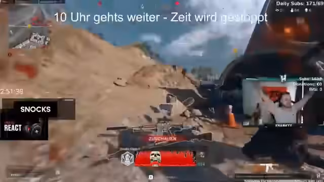 16:07:32Es wird über die Schwierigkeit gesprochen, im Wager Waffen zu kaufen, und die Frage aufgeworfen, wie das im Wager gehandhabt wird. Es wird über einen verdächtigen Kill durch einen Gegner mit einer Kompakt diskutiert, der jeden Schuss getroffen hat. Es wird über einen Spieler gesprochen, der gehackt hat. Es wird über die Frage gesprochen, ob Rager ins Stead gehen darf. Es wird über die gefundenen Waffen und die Strategie diskutiert. Es wird über ein Team gesprochen, das sich komisch verhält. Es wird über die KSV und die AK gesprochen und welche Waffen die Pros spielen. Es wird über das Meatshield gesprochen und wie man es nutzen kann. Es wird über die Frage gesprochen, ob man zu Superstore Hospital gehen soll oder lieber etwas sicherer landen soll. Es wird über die Situation gesprochen, dass vier Leute Arsch an Arsch vor der Tür stehen. Es wird über Shadebun Spark gesprochen. Es wird über eine Cursed-Runde gesprochen. Es wird über ein 4er Team gesprochen. Es wird über die Frage gesprochen, ob man einen Gulag gewinnen soll. Es wird über die Strategie gesprochen, wohin man fliegen soll. Es wird über einen Spieler gesprochen, der am Raiden ist. Es wird über einen Spieler gesprochen, der legit aussieht. Es wird über die Jungs von der Spann-Warsom gesprochen. Es wird über einen Spieler gesprochen, der delayed auf dem Dach landet. Es wird über eine goldene K gesprochen. Es wird über die Position der Gegner gesprochen. Es wird über die Bounty gesprochen. Es wird über den Train gesprochen, der gefighted wird. Es wird über die Waffen gesprochen, die man findet. Es wird über einen Terminator gesprochen. Es wird über einen Bug gesprochen, der verhindert, dass man schießen kann. Es wird über die Gegner gesprochen, die Level 55 ohne Prestige sind und besser treffen als jeder im Twitch Rivals oder WSOB.
