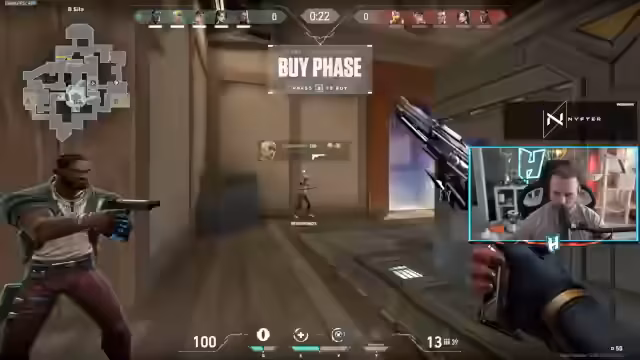 01:56:04Nach der verlorennen Runde findet eine kurze Analyse statt. xhankuys Team erkennt Fehler in der Verteidigung und der Wahl der Waffen (z.B. die Bandit auf große Distanz). Sie beschließen, für die nächsten Runden mehr auf das Sammeln von Geld und das Kaufen von besseren Waffen wie der Vandal zu achten. Der Fokus liegt darauf, die Mitte zu kontrollieren und Rauchgranaten strategisch einzusetzen, um dem Gegner den Zugriff auf bestimmte Bereiche zu verwehren. Man ist zuversichtlich, das Spiel noch drehen zu können.